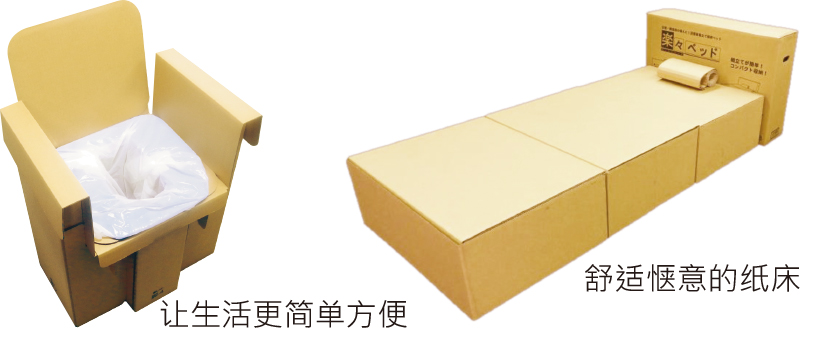 开发在遇到灾害和紧急情况下可灵活使用的产品。例如:通过简单组装便可使用的床和厕所。这类产品在组装前可以折叠,便于搬运,使用后还可环保回收。
